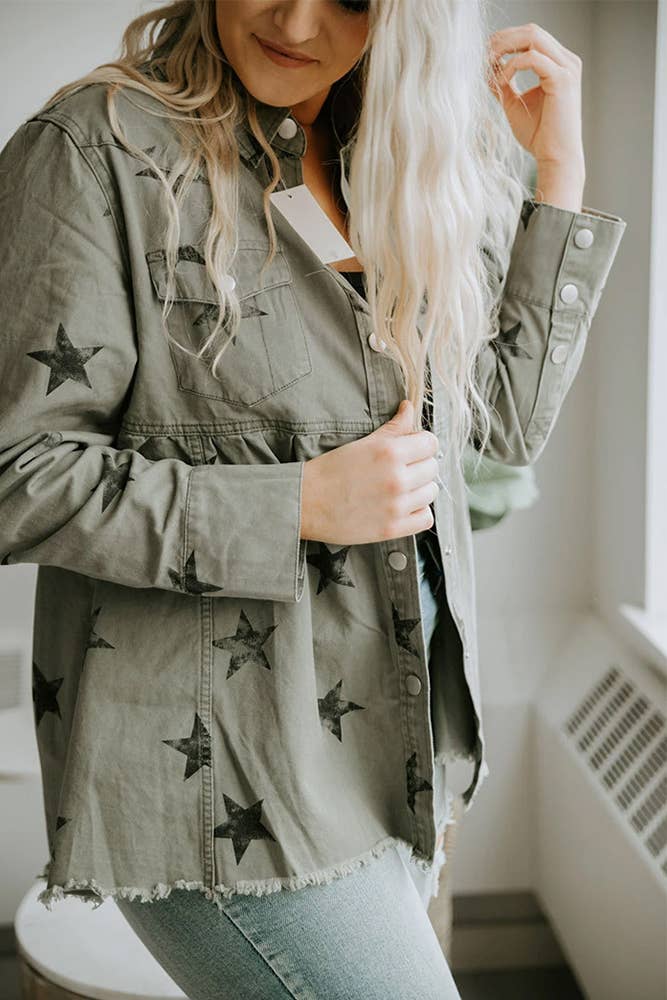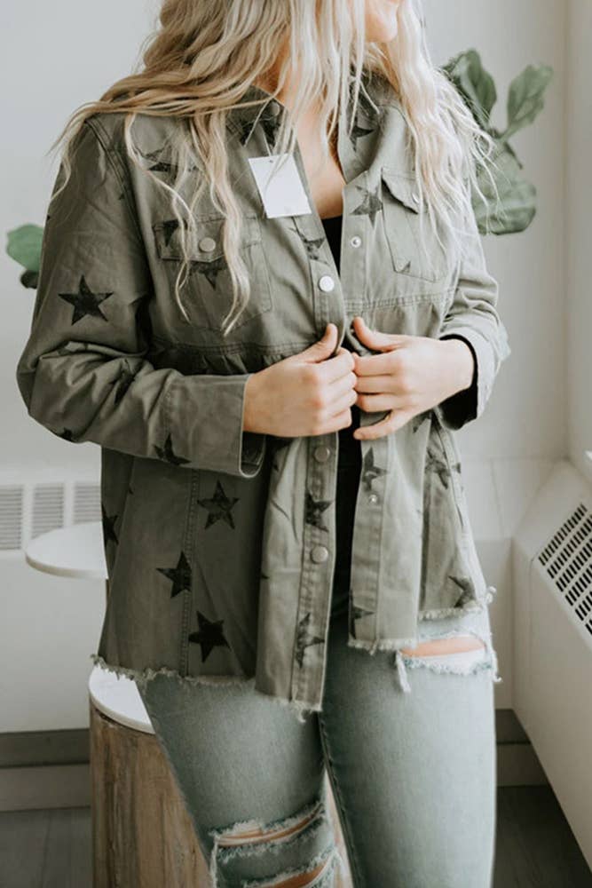 Stars Print Raw Hem Ripped Denim Jacket with Pockets UNISHE Wholesale