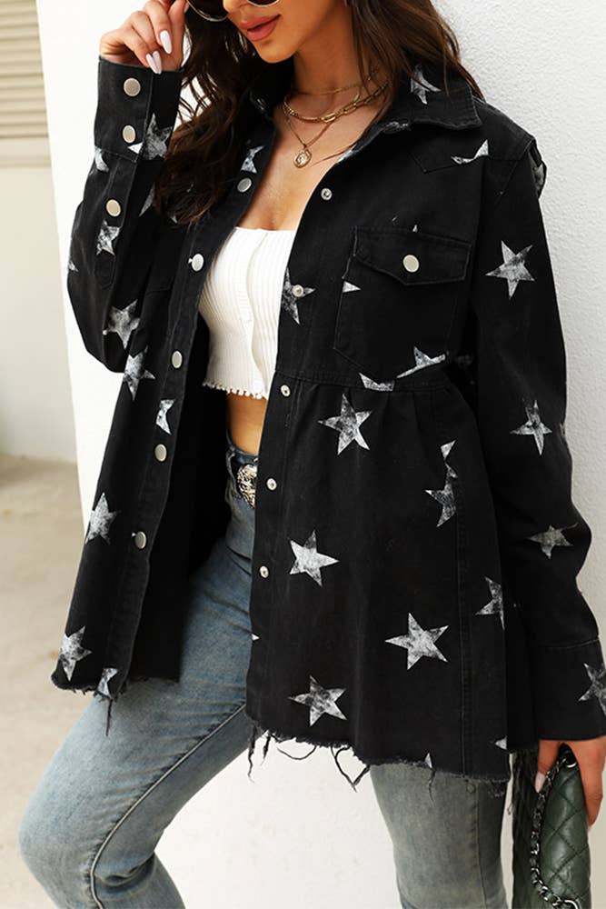 UNISHE - TOPW424 Stars Print Raw Hem Ripped Denim Jacket Shacket: Black / M